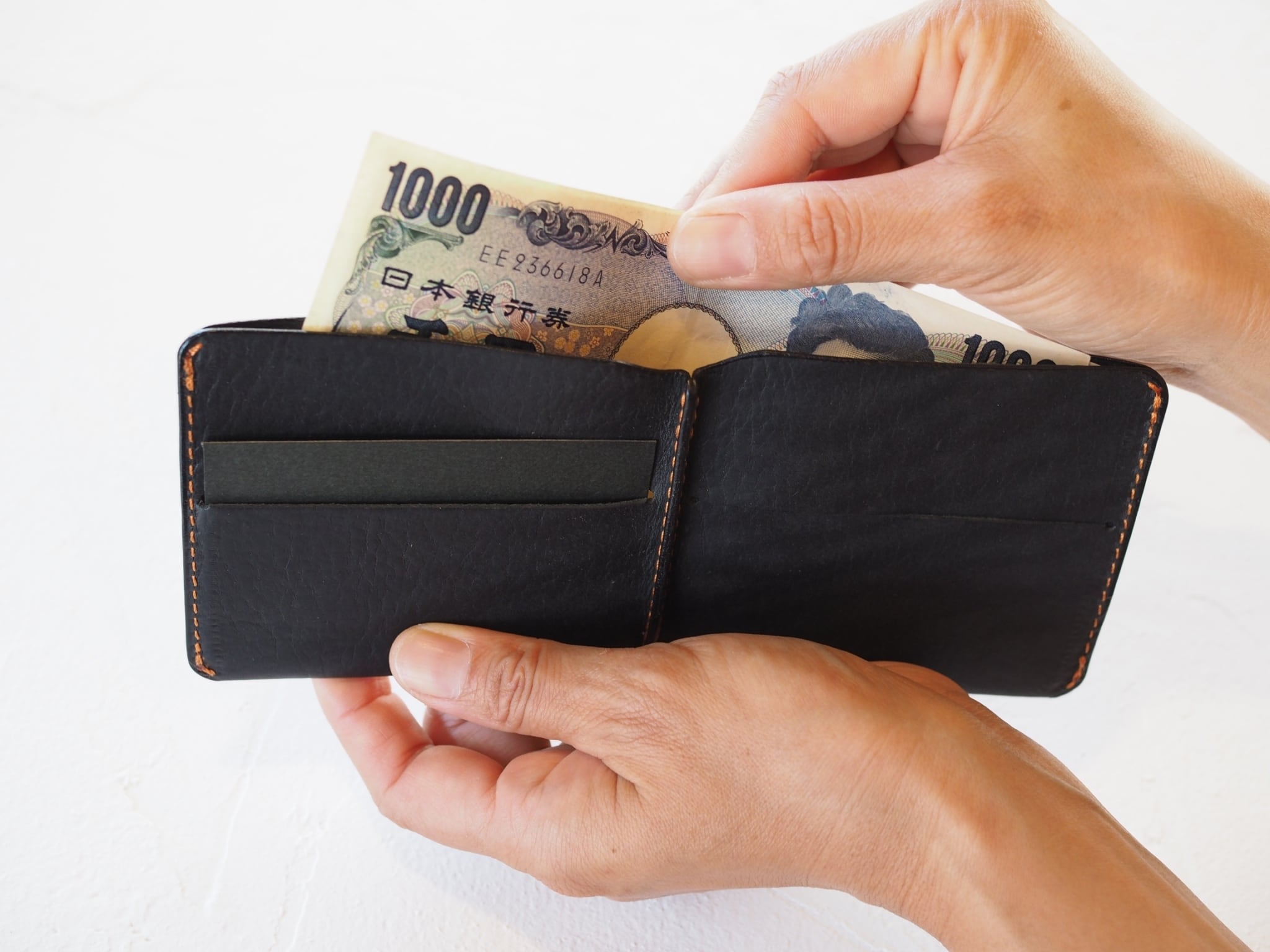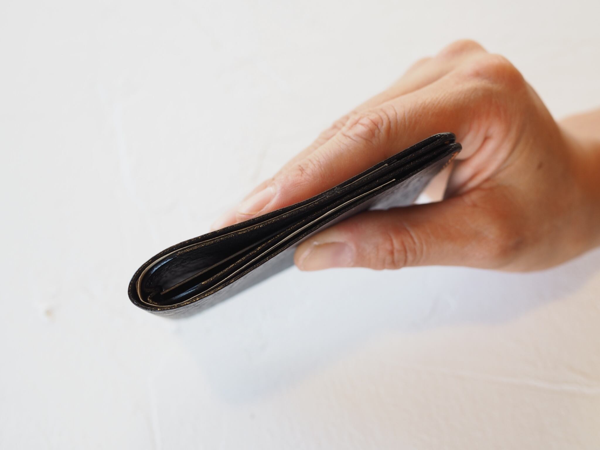 張りのある革を使用しているので、薄いのに頼りになる絶妙な厚さです。
